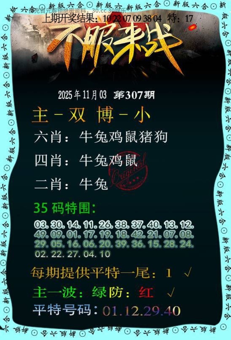 | 306期:七肖 | 鼠牛鸡猴猪蛇羊 | 开:牛17 |